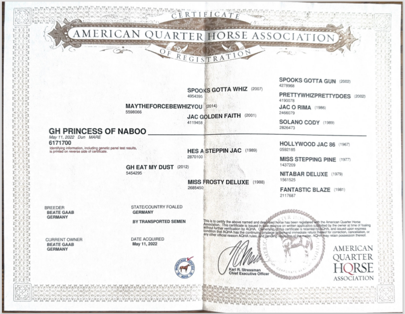 Naboo ist im FNP (Foal Nomination Programm) der NRHA registriert.